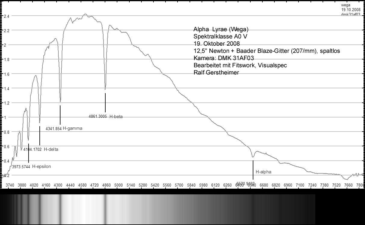 Eines der ersten Spektren, die ich mit dem Baader Blaze-Gitter + Videokamera aufnehmen konnte. Es zeigt sehr schön, wie die Absorptionslinien bei WEGA in immer kürzeren Abständen Richtung Balmergrenze 3648 A wandern. [mehr]